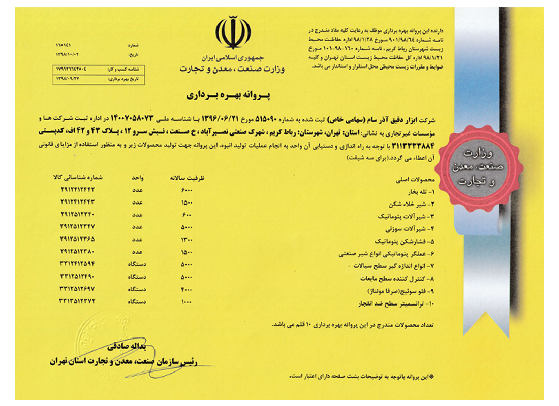 11- پروانه بهره برداری از وزارت صنعت ، معدن و تجارت استان تهران به شماره 112487