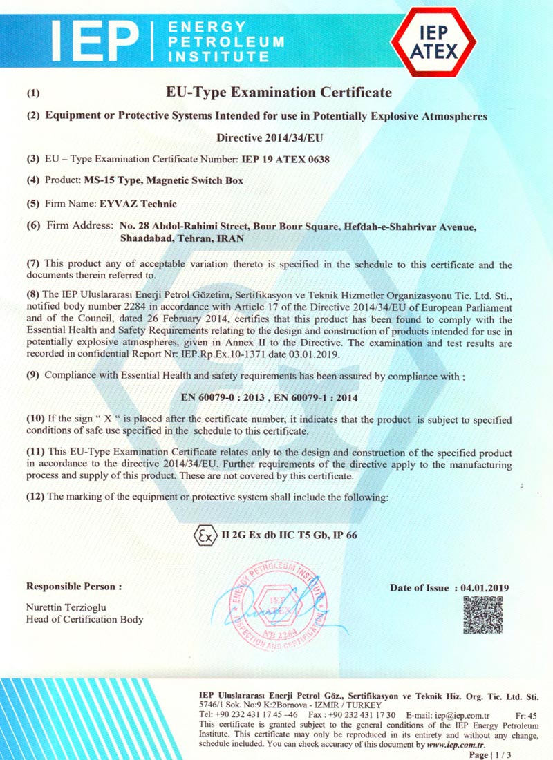 7-گواهی Ex از موسسه IEP ATEX به شماره IEP 19 ATEX 0638 جهت سنسور MS15 لول گیج