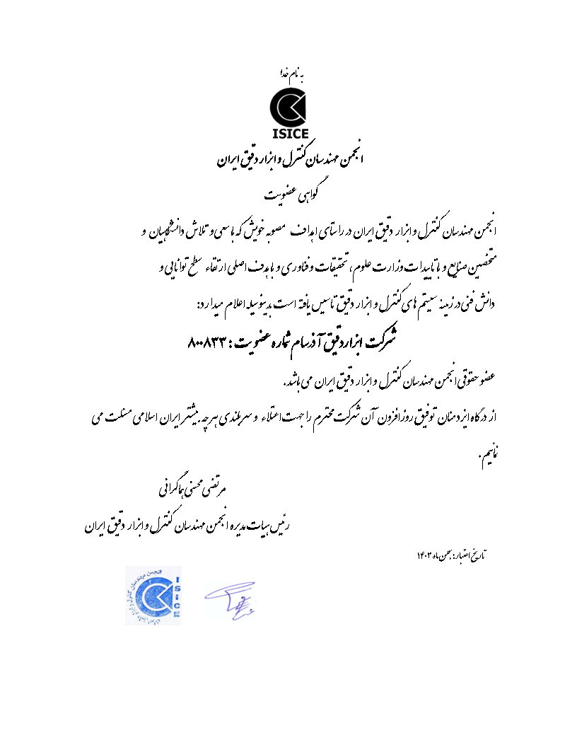 2- گواهی عضویت در انجمن مهندسان کنترل و ابزار دقیق ایران به شماره 800833