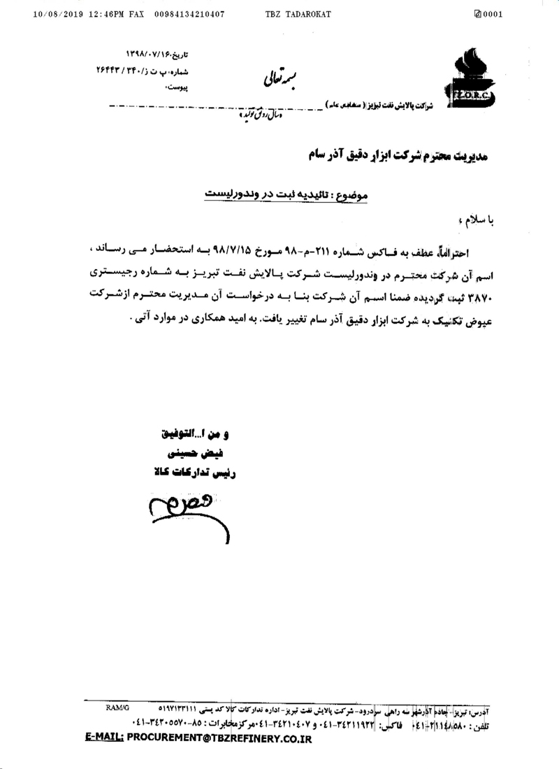شایان ذکر است این شرکت افتخار عضویت در وندور لیست شرکتهایی همچون :
