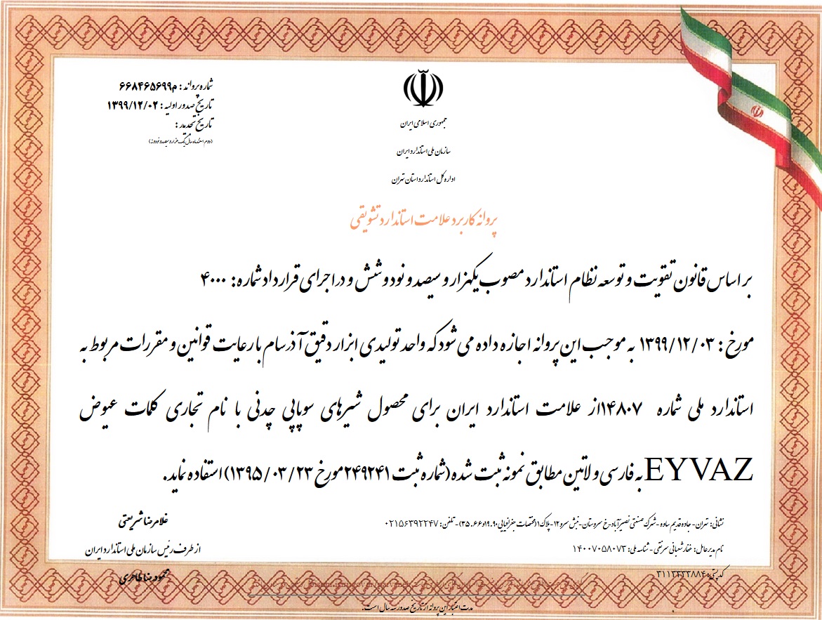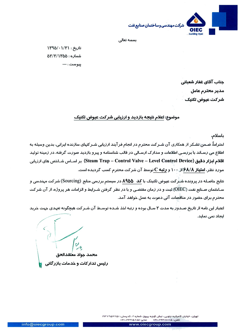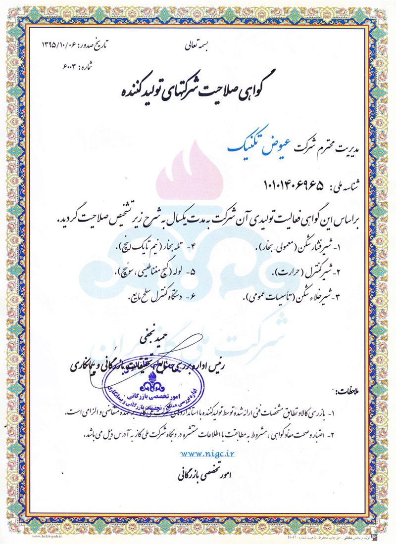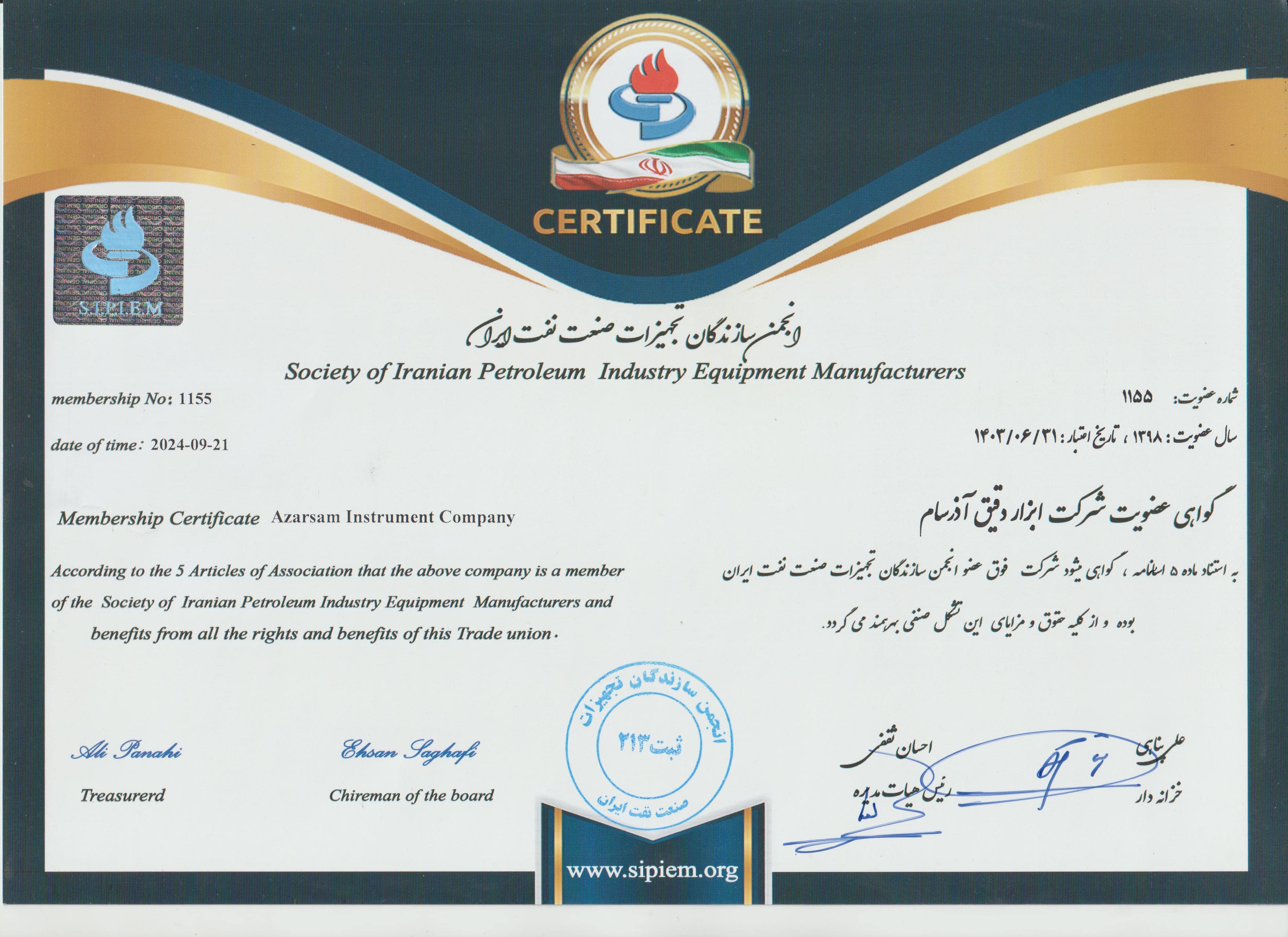 1- گواهی عضویت در انجمن سازندگان تجهیزات صنعت نفت ایران (استصنا) به شماره 1155 در سال 1380