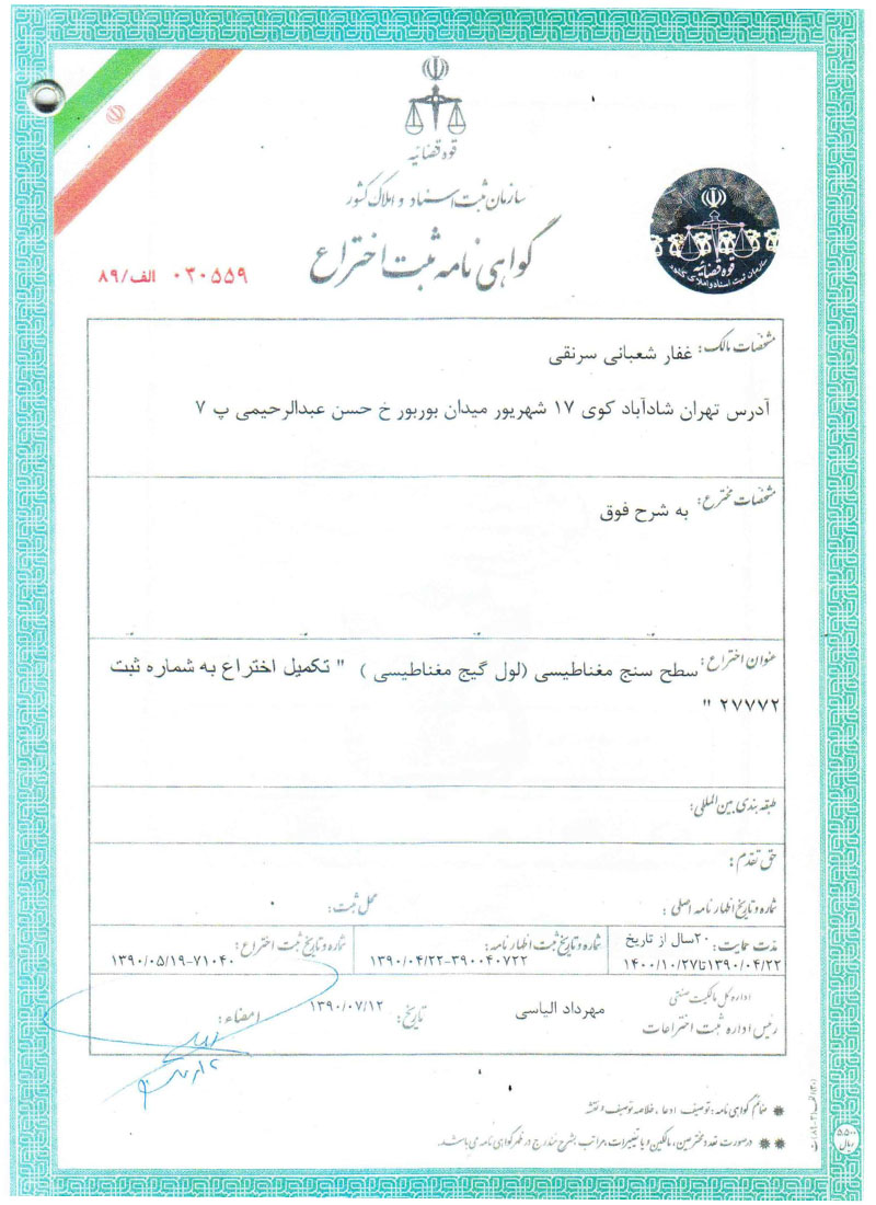 8- گواهی تکمیل اختراع سطح سنج مغناطیسی از اداره کل مالکیت صنعتی به شماره 71040