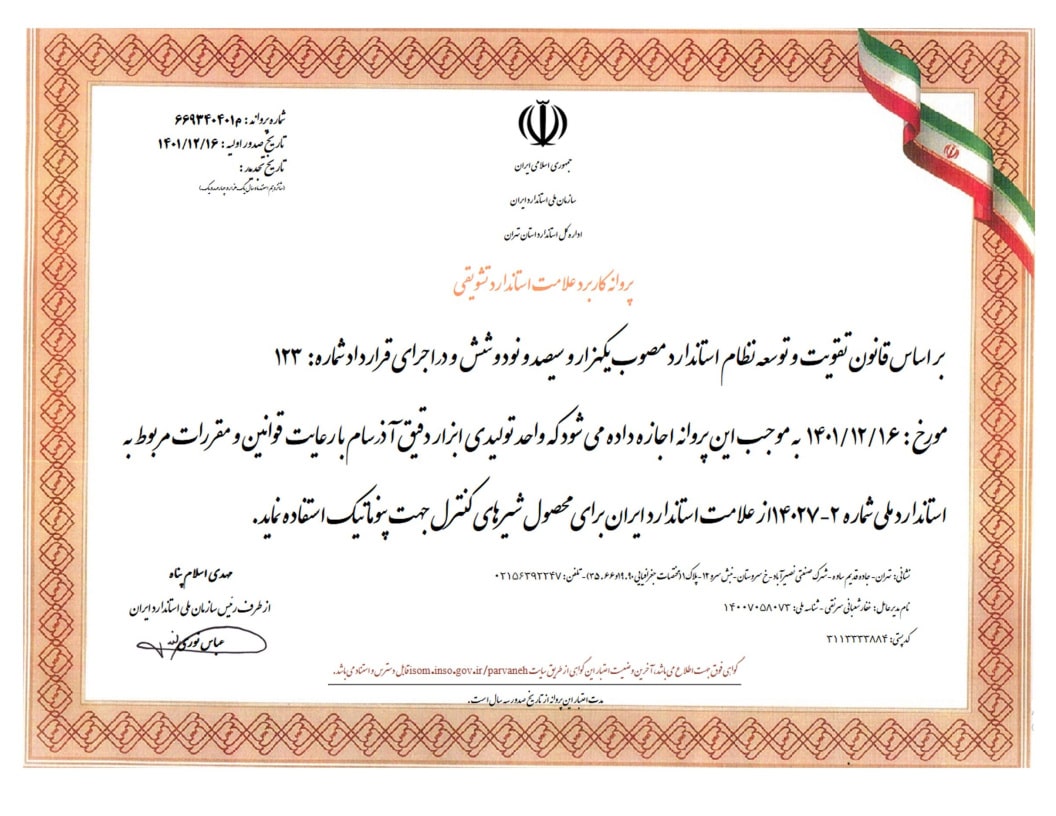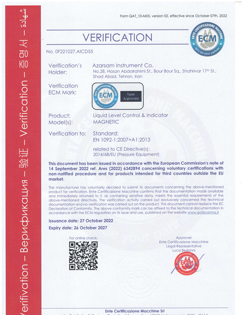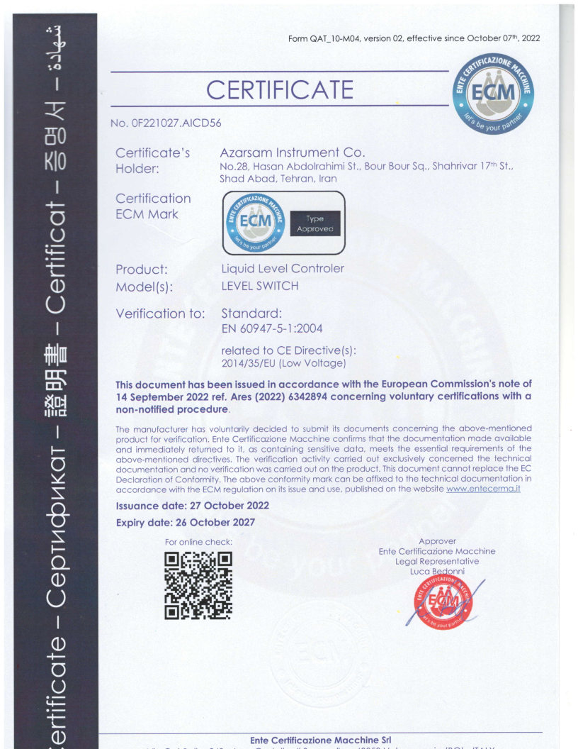 5- گواهینامه CE اروپا از شرکت Ente Certificazione Macchine ECM ایتالیا به شماره ثبت: F171130.ETQ015 جهت لول کنترل و 0F171130.ETQ014 جهت لول گیج